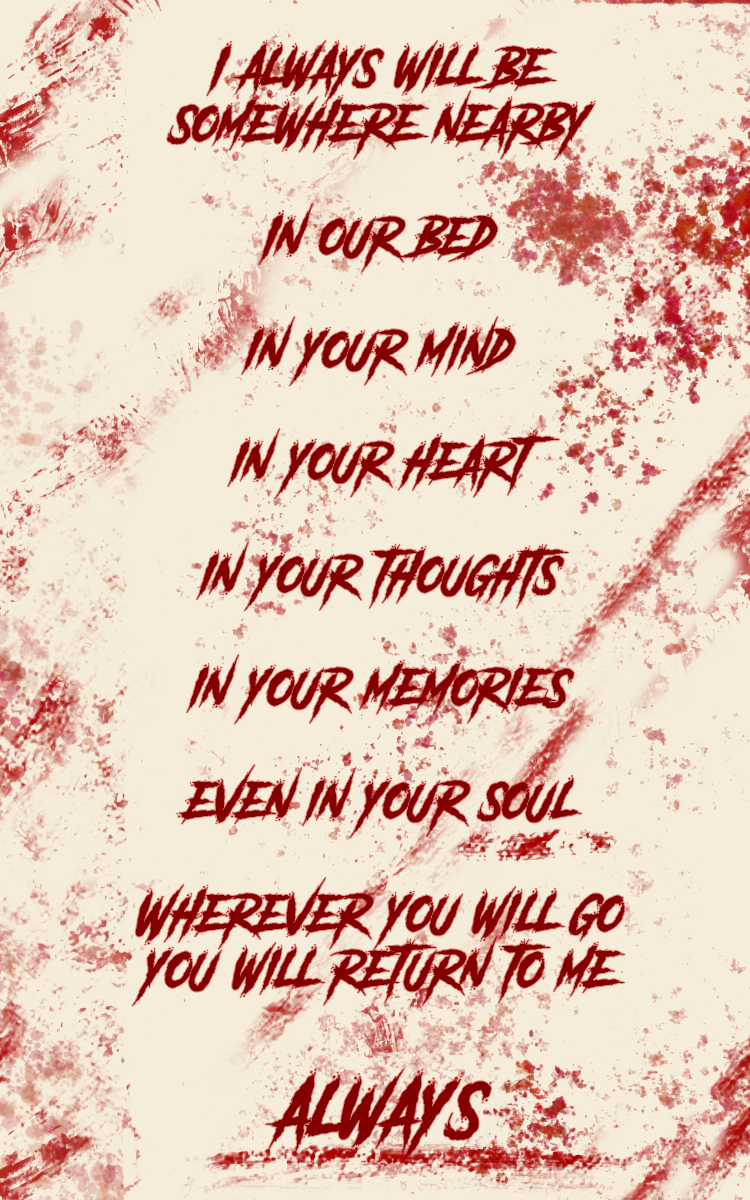 Я всегда буду где-то рядом - в нашей постели, в твоём сердце, в твоих мыслях, в твоих воспоминаниях и даже в твоей душе. Куда бы ты ни пошла. Ты всё равно будешь возвращаться ко мне. Всегда.