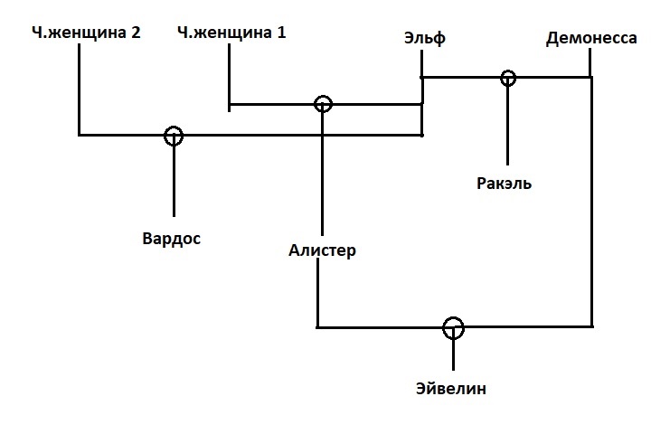 1) Алистер, Вардос и Ракэль - братья/сёстры по отцу-эльфу.